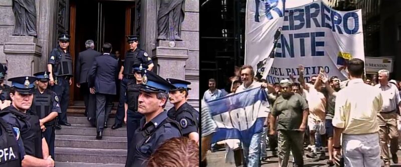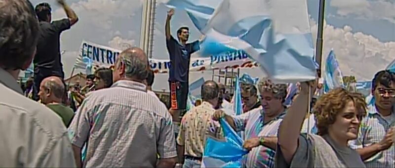 Gritos de angustia en las calles. Una angustia intransigente de las masas que, sin paciencia con los oligarcas, no pueden entrar a los bancos y se acorralan alrededor de sus puertas para demandar lo que merecen. Una propagación implacable desde las decisiones de la élite política hasta sus efectos concretos, materiales. En esta acumulación de cuerpos desgarrados, amenazas de suicidio y descontento con el Poder Ejecutivo ante la desestabilización plural en la economía personal de la ciudadanía, podrán resonar sus imágenes para quienes irrumpe el recuerdo temible de la crisis fiscal de diciembre de 2001, en Argentina. Estas no son, sin embargo, materia pretérita para la prosa audiovisual de Lucas Gallo. Tampoco caen, pese a que los paralelos sean insoslayables, en metáforas para las amenazas libertarias que, del otro lado del río, ahorcan a la población contemporánea. En Diciembre, los materiales de archivo poseen, como si fuesen un heraldo lleno de muerte, todo el cuerpo-imagen de su columna vertebral; un parásito que contamina toda esa angustia. Recobran una contemporaneidad, una simultaneidad con el tiempo del espectador, para volver a esas imágenes desgarradas de las calles en un acto de reconstrucción de todo un organismo vital. Esos meses vuelven a la vida y desembocan en una máquina del tiempo cinematográfica que nos abre una ventana a la manera en que se manifiestan los estragos sociales en tiempos de crisis, y qué respuesta toma la élite política.